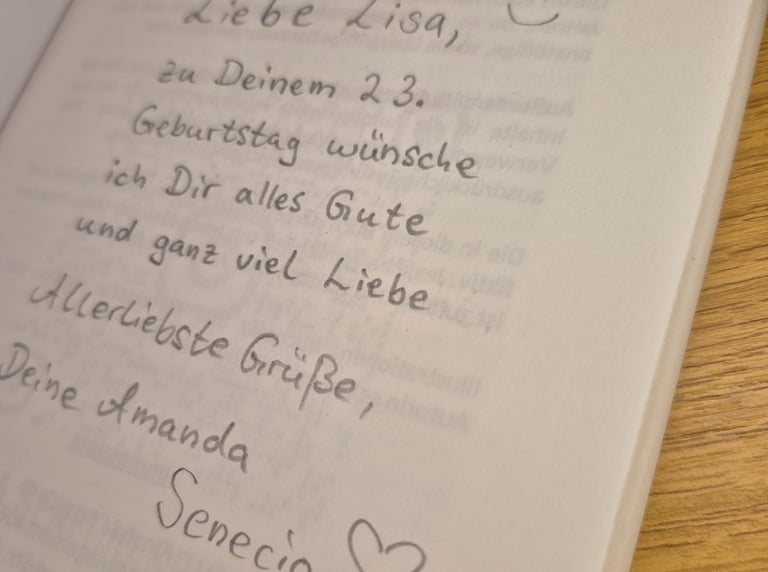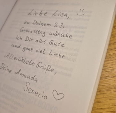 Um deine Bücher signieren zu lassen, bitte lass uns wissen, welche Signatur du dir wünschst (z.B. Geburtstagswünsche). Es kann auch einfach nur der Name der Person genannt werden, für die das Buch signiert werden soll.